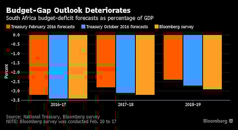 In October, the National Treasury predicted the budget deficit in the year through March 2018 would narrow to 3.1 percent of gross domestic product. The gap is likely to be 3.2 percent in 2017-18, according to the median of 13 economists' forecasts compiled by Bloomberg. The fiscal shortfall puts pressure to the government to borrow more, adding to debt levels.