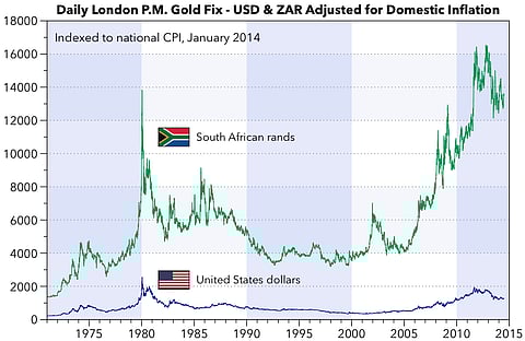 As he writes: "The graph obviously speaks to the rand's weakness against the dollar in key periods (e.g. 2002), but it's also instructive for the inflation differentials (e.g. '98 spike, '02 spike; 1980s acceleration; 2014 accelerating). It is also interesting to observe the decade of relative stability from mid-1992 to mid 2001 when rates converged somewhat. Would likely be difficult to find a better hedge to maintain your purchasing power in SA than to convert rand to gold, especially as a retirement vehicle."
