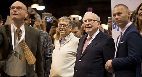 Warren Buffett, chairman and chief executive officer of Berkshire Hathaway Inc., center right, and Bill Gates, billionaire and co-founder of the Bill and Melinda Gates Foundation, center left, watch a newspaper toss outside a Clayton Homes Inc. display on the exhibit floor ahead of the Berkshire Hathaway annual meeting in Omaha, Nebraska, U.S., on Saturday, May 6, 2017. Buffett said during the Berkshire investors gathering that he's more inclined than usual this year to sell some assets because the tax advantage could soon diminish for divesting securities at a loss. Photographer: Daniel Acker/Bloomberg